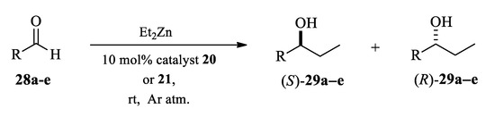The mixture of appropriate catalyst (0.15 mmol) and 1 M Et2Zn in n-hexane solution (1.5 mL, 1.5 mmol) was stirred for 25 min in argon atmosphere at room temperature and then appropriate aldehyde (1.5 mmol) was added to the mixture in one portion. After 20 h of stirring at room temperature, the reaction was quenched with saturated NH4Cl solution (15 mL) and extracted with EtOAc (2 × 20 mL). The combined organic layer was washed with H2O (10 mL) and dried (Na2SO4) and the solvent was evaporated under vacuum resulting in 25 and 29a–e. The ee and absolute configuration of the resulting phenyl-1-propanol (25) were determined by chiral GC on a Chirasil-DEX CB column after O-acetylation in Ac2O/DMPA/pyridine [65,66] and without derivatization for 1-cyclohexyl-1-propanol (29d) and 3-heptanol (29e) [37]. Identification of 29a–c was done by chiral HPLC analysis on a Chiralcel OD-H column with V(n-hexane)/V(2-propanol) = 98:2 mixture, 1.0 mL/min, 210 nm and the direction of the optical rotation of products was also checked [37].