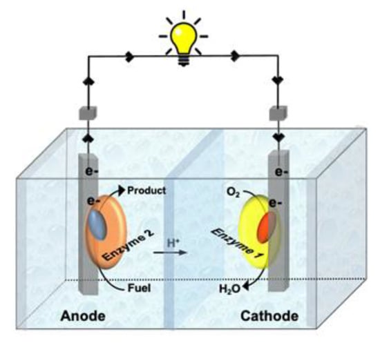 For all living systems, enzymes are of paramount importance because they are involved in several biochemical reactions taking place in living systems. Generally speaking, enzymes increase the reaction rate by a factor up to 10 as compared with an uncatalyzed reaction. A variety of organic and inorganic materials are oxidized through oxidizing enzymes or reduced by reducing enzymes obtaining electrical energy or high-value chemicals. As illustrated in Figure 1, enzymatic fuel cells (EFCs) directly convert chemical into electrical energy using enzymes as catalysts. The frequently used enzymes for anodic reaction are the enzyme family of oxidases and dehydrogenases [,,,]. Both enzyme families remove electrons from the substrates (glucose, alcohols, alanine, and so on) and transfer them to the anode electrode. One drawback of the oxidase family, however, is converting O2 to toxic H2O2 as one of the final enzymatic products and lowering the O2 level in the solution. On the other hand, use of dehydrogenases, which do not consume O2, in EFC has thus received increasing attention recently.