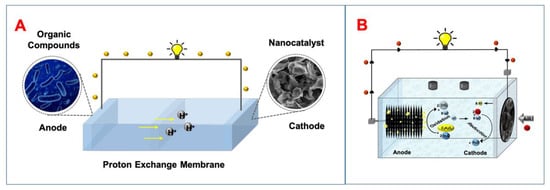Differently from EFCs, MFCs directly convert chemical into electrical energy using microorganisms as catalysts, which can either be located in both the anode and cathode, or only the anode or only the cathode []. There are several designs of MFC currently being used, dual or two-chamber MFC and single chamber MFC (Figure 2).