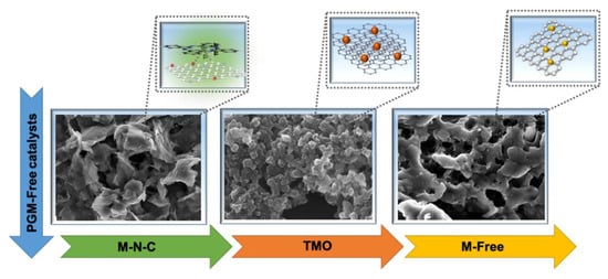 Among PGM-free catalysts, M-N-C (metal-nitrogen-carbon) [], TMO (transition metal oxide) [], and activated carbon (metal-free) catalysts [] can be considered the most representative of the series of best performing materials. Figure 3 schematically represent the three classes of PGM-free catalysts, which will be reviewed and discussed in detail below.