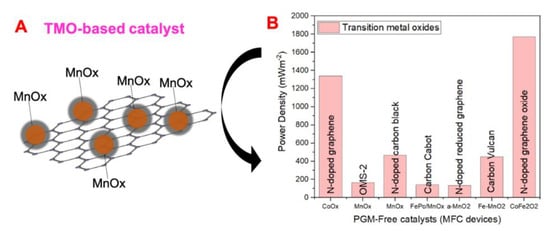 Among PGM-free catalysts, transition metal oxides have also been exploited for oxygen reduction reaction in MFC devices. It is owing to their properties such as structural diversity, electrochemical activity, and ease of doping. In addition, TMOs can be combined with conductive carbon materials as an approach to improve the electronic conductivity of the catalyst. Hannah Osgood and co-workers have synthesized different TMOs (Fe2+/3+, Co2+/3+, Mn3+/4+, and Ni3+/4+) and evaluated the effect of structure on ORR activity []. Electrochemical conductivity has been also identified as a key factor to enhance ORR performance. Along combining TMOs with carbon support, electrical conductivity can be improved by introducing defects in the matrix (dopants or electronic structures) []. The importance of crystallite size and morphology on ORR performance was discussed by Goswami et al., studying cobalt oxides, copper oxides, manganese oxides, and iron oxides combined with different types of conductive materials like carbon nanotubes, carbon nanofibers, mesoporous carbon, and graphene []. Sun and co-workers developed different TMOs (FeOx, MnOx, and CoOx) on graphene oxide, demonstrating that ORR performance and mechanisms are structure-dependent []. Seonghee et al. have synthetized three N-doped carbon/TMO (Fe, Co, Ni) catalysts by the plasma process and studied its electrochemical behaviour toward ORR. The catalyst containing iron oxide exhibited the best catalytic activity, and this can be attributed to the coordination of Fe cations with graphitic nitrogen and pyridinic nitrogen, increasing oxygen reduction activity []. A nanocomposite catalyst based on cobalt oxide and nitrogen-doped graphene was also prepared and assembled at the cathode side of an MFC. The catalyst had long-term stability in neutral electrolyte and achieved a power density of 1340 mWm−2, very close to that achieved with Pt/C assembled on air-cathode MFC [].