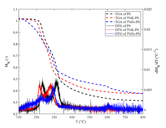 TGA and DTG diagrams from pyrolysis of PS, 5%K-PS, and 5%Fe-PS of residual mass fraction (MR) and -dMR/dT vs. temperature at heating rate = 30 °C min−1 in N2.