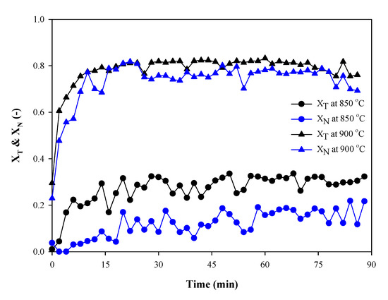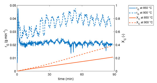 In 90 min reforming of tar model compounds over PSC, the trends of toluene (XT, -) and naphthalene conversion (XN, -) at 850 °C and 900 °C are depicted in Figure 2. It is apparent that higher XT and XN of roughly 0.8 can be reached at 900 °C at the end of testing. However, conversions needed some time to approach the stable state from low conversions. This phenomenon was also observed when using WC and SC as catalysts (shown in Section 2.2.2). For example, XN at 900 °C in Figure 2, increases from 0.24 to 0.80 during the initial 15 min, which suggests that the catalytic activity can be enhanced in this time range. After pyrolysis, high porosity is not accessible as the pores fill from disorganized carbon from the deposited tar, which reduces the surface area and pore distribution on the char surface [36]. However, with a high content of steam and high temperature during tar reforming, the gasification of char can take place and change the surface property of chars. According to Fuentes-Cano et al. [37], when the rate of carbon (char and soot) gasification is higher than that of coking during tar reforming, the surface area and porosity of the char are increased, resulting in a better activity of the char. Consequently, with high steam content in SEG derived syngas, the steam activation process (gasification) for more surface area of chars might be directly carried out at elevated temperatures during tar reforming. In order to verify this phenomenon, a method was established here, for presenting the gasification of palm shell char during the reforming of tar model, compounds. The gasification rate (rG, g min−1) of the char was then calculated here during 90 min reforming.