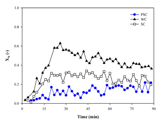 XN of naphthalene reforming over PSC, WC, and SC is depicted in Figure 4, which illustrates that naphthalene reforming over wood char presenting the best activity of naphthalene reforming at 850 °C in the whole 90 min. Here only XN is depicted in Figure 4 to avoid the interference of showing toluene conversions. The toluene conversion trends, from each biochar, also indicated that WC had the best catalytic activity at 850 °C. The method described in Section 2.2.1 was also adopted to 90 min reforming of tar model compounds over WC and SC to compare the gasification rate and carbon conversion of different biochars. Due to the difference in bulk density of different biochars, rG is then divided by individual MC (rG/MC, min−1) of them for the comparable rate of gasification. Figure 5 shows that SC has the most drastic gasification with XC = 0.60 in 90 min reforming, which may be due to the highest ash content among these three biochars with abundant AAEM groups. Some research has confirmed that AAEM groups enhance the gasification rate of biochars [40,41]. This surmise also agrees with WC, which is more susceptible to steam for gasification with XC = 0.35 in 90 min reforming than PSC because of a higher content of AAEM groups. With the least content of AAEM groups, rG/MC of PSC remains almost constant during the whole time reforming range. At 850 °C, XC at 90 min of PSC (=0.21) is much lower than those of WC and SC, demonstrating a stabilized characteristic at high temperature and rich steam concentration environments.