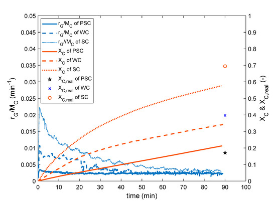Comparison of calculated rG/MC and Xc during 90 min tar reforming over PSC, WC, and SC at 850 °C.