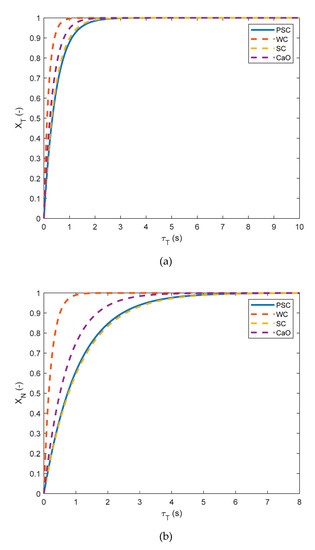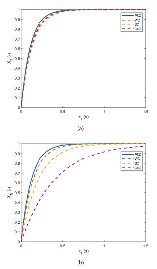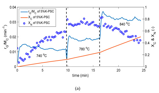 rG of PSC is defined as the rate of reacted carbon from PSC, while rG can also be assumed equal to the rate of production of CO and CO2 stemming from PSC presented in Equation (1) on the basis of gasification reactions as shown in Equations (13) and (18) (Reactions are described in Section 3.5) [38], where mC*, mC_CO, and mC_CO2 (g) are the mass of carbon in the char, in the produced CO, and in the produced CO2 at time t, respectively: