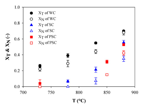 XT and XN from tar reforming over PSC, WC, and SC at different temperatures.