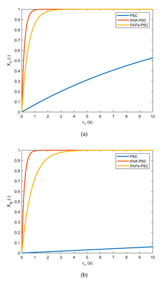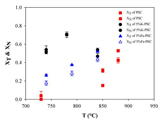 The average conversions of 5%K- and 5%Fe-PSC from the tests in Figure 6 are depicted in order to understand whether conversion can be enhanced in the presence of additional K and Fe. Figure 8 shows that 5%K-PSC has an excellent catalytic activity with high XT and XN = 0.7 at moderate temperature = 780 °C. However, both conversions decrease to 0.54, and 0.47, respectively, at 840 °C, caused by rapidly decreasing char amount owing to drastic char gasification, which has been explained in Section 2.3. With the iron on the surface, the catalytic activity was also promoted, giving higher conversions of toluene and naphthalene than PSC. These findings correspond to the references [24,25,26,28] that potassium and iron enhance the ability of tar decomposition over biochars in a steam-hydrogen rich environment.