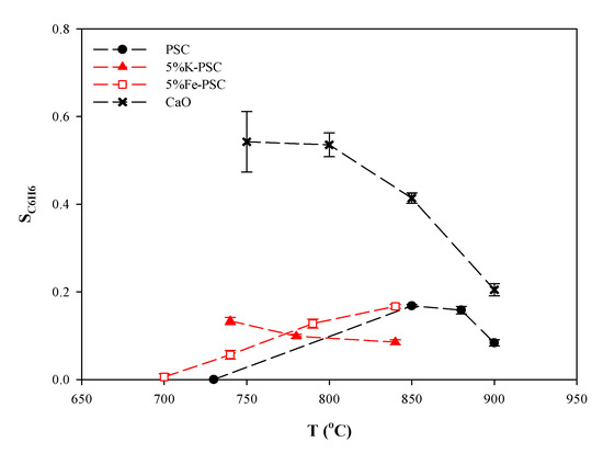 SC6H6 of PSC, 5%K-PSC, 5%Fe-PSC, and CaO at different temperatures.