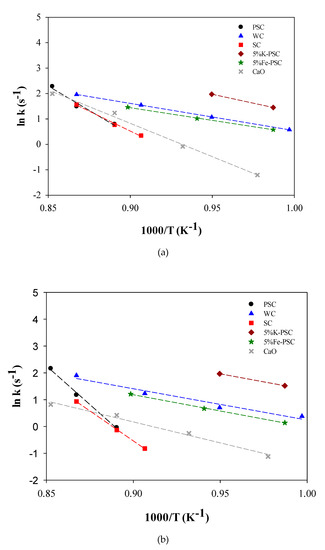 By substituting respective k and reforming temperature (Tr, k) into Arrhenius’ law (Equation (9)), the activation energy (Ea, kJ/mol) (assumed to be constant in the studied temperature range) and the apparent pre-exponential factor (k0) can be computed. Then both kinetic parameters can be compared with the results of other researchers to evaluate the activity of the applied catalysts for tar reforming,