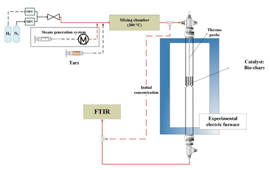 A high-temperature laboratory-scale catalytic tar reduction system capable of operating at various conditions was developed in this study, as shown in Figure 14. Low-cost materials (PSC, 5%K-PSC, 5%Fe-PSC, WC, SC, and CaO) were tested as the catalysts filled in the reactor. All pipes were heated up above 180 °C to avoid condensation of tar. A relevant test gas with 15 vol % H2O, 7.5 vol % H2 (99.9%, Westfalen AG, Münster, NW, Germany), and tar model compounds was premixed in N2 (99.999%, Westfalen AG, Münster, NW, Germany) simulating the essential components of the raw syngas from the SEG process [2,3,4]. The tar model components were toluene (99.5%, Merck KGaA, Darmstadt, HE, Germany) and naphthalene (Riedel-de Haën AG, Seelze, NI, Germany), amounting to total tar concentration of circa 10 g m−3NTP. The residence times of the gas (τNTP, s) over the biochars and CaO were 0.17 and 0.51 s, respectively, calculated by the bulk volume of the catalyst bed (Vbed, m3) divided by total flow rate (QNTP, m3 s−1). Long-term tests of PSC, WC, and SC with 90 min reforming were conducted at different temperatures.