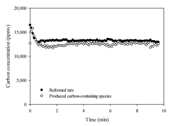 The concentrations obtained from FTIR were able to quantify the present reagents and products. AS biochar was simultaneously gasified during the reforming of tar model compounds, carbon balance was hard to prove with the parallel production of carbon-containing species from biochar. As a result, CaO was also used as a reference catalyst for confirming that the experimental process in this study gave a credible carbon balance during the reforming. Figure 15 depicts the carbon balance of the reforming of tar model compounds over CaO at 850 °C between reacted tar model mixture and majorly produced carbon-containing species (CO, CO2, CH4, and C6H6). Since there is a good fit between carbon conversed and carbon produced, a constant total volume flow rate before and after the reaction was then assumed in this study. Here, gasification of biochar catalysts was also assumed to have no influence on total volume flow.