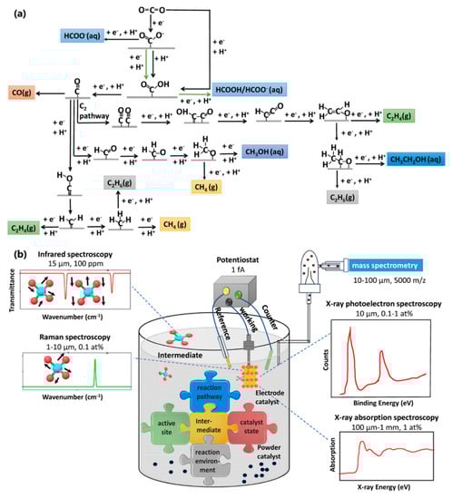 (a) Possible CO2RR pathways. (b) Representative in situ characterization illustrated here to gain insight on reaction intermediates, active sites, preferred reaction pathways, the effect of the reaction environment on reaction pathways, and changes that a catalyst undergoes under reaction conditions. Dark circles represent powdered catalysts. The isolated molecule is a representative intermediate/production.
