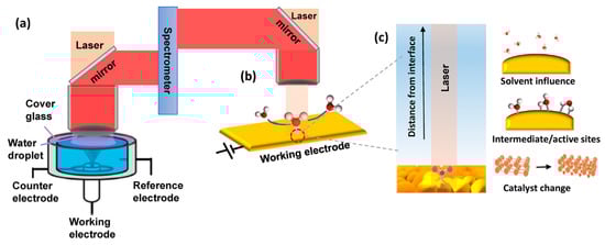 Schematic diagram of modern in situ (a) electrochemical–Raman spectroscopy (EC-RS) and (b) surface-enhanced RS (SERS) setups. (a) is reprinted with permission from Reference [79]. Copyright 2016 American Chemical Society. (c) In situ RS allows for probing solvent, intermediate, and catalyst state.