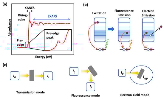 There are three XAS modes for testing the specimen (Figure 6b,c). Transmission mode detects the difference between the incident and transmitted X-ray after the X-ray interacts with the specimen. The attenuation of X-ray intensity can be characterized by the X-ray absorption coefficient [103,107], according to Beer’s law [108]. From the data quality point of view, the sample should be concentrated and homogenous [108]. Fluorescence mode collects the emitted X-ray from an element. This mode is more suitable for dilute specimens since the emission intensity is also affected by the self-absorption apart from the absorption of the element. Electron yield mode measures the emitted photoelectrons. Different from the above bulk sensitive modes, electron yield mode is surface-sensitive due to the relatively short mean free path of photoelectrons (~10 Å) [107].