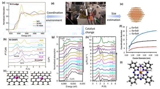 (a) Ni K-edge XANES, (b) Ni K-edge Fourier transformed EXAFS spectra and (c) different atomic configurations in a graphene matrix for Ni–NG catalyst; (a–c) are reprinted with permission from Reference [112]. Copyright 2018 Royal Society of Chemistry. (d) Photo of a real electrochemical cell for in situ XAS experiment setup. Reprinted with permission from Reference [129]. Copyright 2019 Springer. (e) A five-shell cuboctahedral Cu nanocrystal model and (f) its size-dependent Cu–Cu CNs for the first three shells of nearest neighbors. (g) In situ Cu K-edge XANES spectra and (h) Fourier-transformed Cu K-edge EXAFS spectra for CuPc; (i) Atomic structures of CuPc; (e–i) are reprinted with permission from Reference [115]. Copyright 2018 Royal Society of Chemistry.