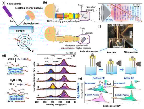 (a) Schematic illustration of X-ray photoelectron (XPS). (b) Representative setups of the differentially pumped analyzer (up) and a membrane-covered cell (down). Reprinted with permission from Reference [148]. Copyright 2018 Wiley-VCH. (c) Schematic of three-electrode electrochemistry setups in the XPS chamber. Reprinted with permission from Reference [139]. Copyright 2015 SNL. (d) Left: an overview of surface reactions of CO2 on Cu(111) under various in situ conditions. Right: C 1s and O 1s photoelectron peaks and multi-peak fitting results obtained for the various experimental conditions and investigated surfaces (at r.t., 298 K). Reprinted with permission from Reference [140]. Copyright 2017 PNAS. (e) Quasi in-situ Cu LMM XPS spectra acquired on Ag-supported Cu dendrites before (left) and after 1 h of CO2RR at an applied potential of −0.9V vs. RHE (right). Reprinted with permission from Reference [141]. Copyright 2019 American Chemical Society.