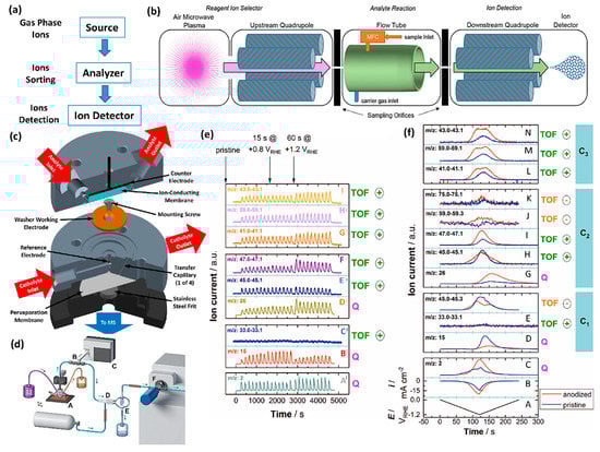 (a) MS flow chart. (b) Schematic of the different sections of a selected-ion flow-tube (SIFT) based MS. Reprinted with permission from Reference [151]. Copyright 2018 Wiley. (c) Schematic of differential electrochemical mass spectroscopy (DEMS) cell. Reprinted with permission from Reference [150] Copyright 2015 American Chemical Society. (d) Basic components of electrochemical real-time mass spectrometry (EC-RTMS). A: scanning flow cell; B: gas-liquid separation; C: gas analyzer; D: nebulizer; E: spray chamber; F ion source. (e) The EC-RTMS method used for the determination of products. A: hydrogen; B: methane, C: methanol; D: ethylene; E: acetaldehyde; F: ethanol; G: allyl alcohol; H: propionaldehyde or acetone, I: propanol. (f) CO2RR of pristine (in blue) and anodized copper (in red). The applied potential sweep (A), measured current (B) and resulting mass signals for different compounds are shown versus time: C: hydrogen; D: methane; E: methanol; F: formic acid; G: ethylene; H: acetaldehyde; I: ethanol; J: acetate; K: glyoxal; L: allyl alcohol; M: propionaldehyde or acetone; N: propanol. Q: denotes gaseous products; TOF+ or TOF-: liquid products determined with a time-of-flight-MS direct analysis in real-time in positive or negative mode; (d–f) are reprinted with permission from Reference [152]. Copyright 2019 Wiley.