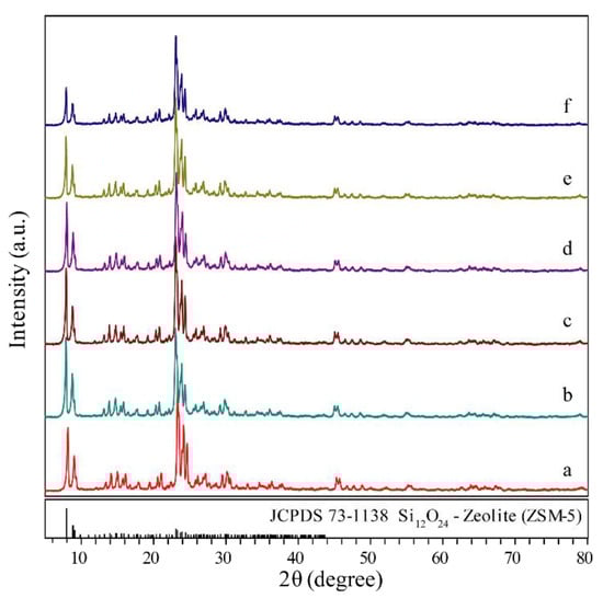 XRD patterns of the different catalysts: (a) HZSM-5, (b) 0.5% P/HZSM-5, (c) 1% P/HZSM-5, (d) 2% P/HZSM-5, (e) 3% P/HZSM-5 and (f) 5% P/HZSM-5.