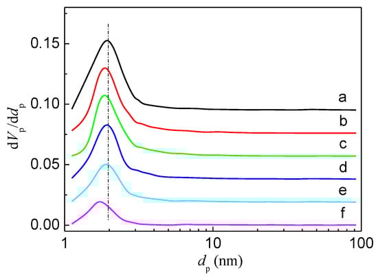 Pore size distribution of parent and P modified HZSM-5 zeolites: (a) HZSM-5, (b) 0.5% P/HZSM-5, (c) 1% P/HZSM-5, (d) 2% P/HZSM-5, (e) 3% P/HZSM-5 and (f) 5% P/HZSM-5.