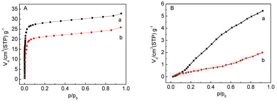 Nitrogen adsorption/desorption isotherms were measured at –196 °C on a BELSORP-max gas adsorption analyzer (MicrotracBEL, Osaka, Japan). The adsorption isotherms of p-xylene and m-xylene on the zeolites were measured at 25 °C on the BELSORP-max instrument. The measurement process and result analysis were similar to those described in our previous work []. Similarly, temperature-programmed desorption of NH3 (AutoChem II 2920 chemisorption analyzer, Micromeritics, Atlanta, GA, USA) (NH3-TPD, to obtain the amount and strength of acid sites), and infrared spectra for pyridine adsorption (Tensor 27 FT-IR spectrometer, Bruker, Karlsruhe, Germany) (Py-IR, to get the acidity of Brönsted and Lewis acidic sites []), were performed by following similar procedures with the same apparatus as reported previously [,].