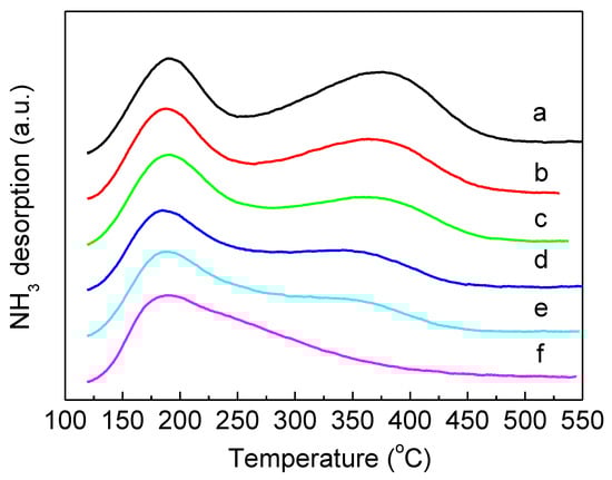The total acid quantity and strength of acid sites in parent and P-modified HZSM-5 zeolites were obtained by NH3-TPD, as shown in Figure 4. The HZSM-5 zeolite exhibited a typical NH3- TPD profile with two characteristic peaks at about 190 and 380 °C, representing the ammonia adsorbed on the weak acid sites and strong acid sites, respectively []. After the doping with P, the evident changes in the peak temperature and area of the strong acid sites were observed. The peak temperature of the strong acid sites shifted towards a low temperature and the peak area decreased obviously. The more P doping was used, the smaller the peak area became, indicating that the decrease in the amount and strength of strong acid sites was due to the doping with P. The low-temperature peak also slightly shifted toward a low temperature, demonstrating that the loading of P also reduced weak acid strength. The difference was that the density of weak acid sites in low temperature was less affected with the increase in P loadings (as listed in Table 2).