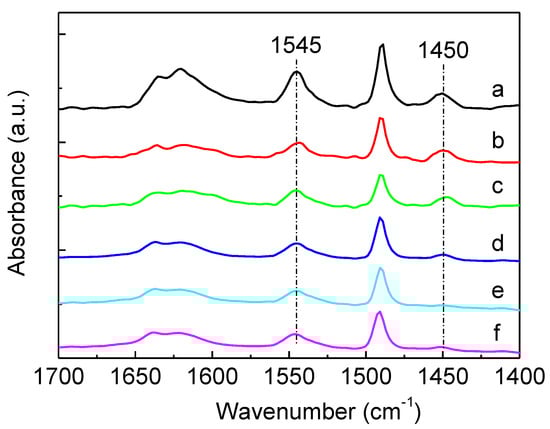 Chemisorption of pyridine on HZSM-5 and P-modified HZSM-5 zeolites also illustrated the changes in zeolite acidity. As shown in Figure 5, all catalysts showed absorption peaks at about 1545 and 1450 cm−1, which were ascribed to pyridine chemisorbed on Brönsted (B) acid sites and pyridine adsorbed on Lewis (L) acid sites, respectively [,]. The incorporation of phosphorus led to a dramatic decline in the amount of both Brönsted and Lewis acidic sites. When small amounts of P were added (≤1 wt.%), the acid amount of the Brönsted acid sites showed a sharp decrease compared to that of the Lewis acid sites (as listed in Table 2). Whereas, further increasing phosphorus content from 1 to 5 wt.% resulted in an evident decrease in the acid amount of the Lewis acid sites and a slight decrease in the amount of the Brönsted acid sites. In summary, the loading of phosphorus reduced both the acid strength and amount of HZSM-5 zeolite, especially strong acid sites.