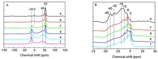 27Al MAS NMR has been extensively used as an effective technique to identify states of the Al atoms in the zeolite. Figure 6A showed 27Al MAS NMR spectra of HZSM-5 and P/HZSM-5 samples. For the parent HZSM-5 zeolite, a characteristic peak of typical Al species around 53 ppm was detected that could be ascribed to a tetrahedral framework aluminum []. A relatively weak signal appeared at 0 ppm which could be assigned to octahedral aluminum species, revealing that there existed a small number of extra-framework aluminum species in the HZSM-5 zeolite. With increasing impregnation degree, new peaks at about −14 and 40 ppm appeared. The signal at −14 ppm was related to octahedral aluminum interacting with a P atom []. The peak around 40 ppm was generally assigned to a tetrahedral framework aluminum or extra-framework aluminum species in a distorted environment []. With the increase in P loadings, the intensity of signals at −14 and 40 ppm increased while that at 53 ppm decreased, illustrating that the dealumination of the HZSM-5 zeolite framework occurred as a result of the phosphate impregnation, consistent with the XRD, micropore volume and acidity measurement results.