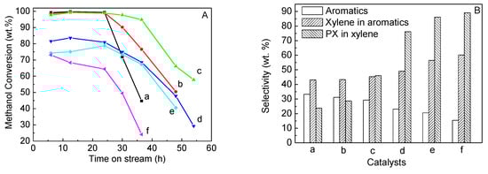 The MTA reaction was performed in a fixed-bed micro reactor (Pengxiang, Tianjin, China). The reaction was carried out with methanol WHSV of 3.2 h−1 at 390 °C and 0.5 MPa. The zeolite catalysts were crushed and sieved to 20–40 mesh and pretreated at reaction temperature for 8 h in a nitrogen flow. The gas and liquid products were separated with a cold trap and analyzed by gas chromatographs (7890A, Agilent, Palo alto, CA, USA). The specific parameters of GC were the same values as described previously [].