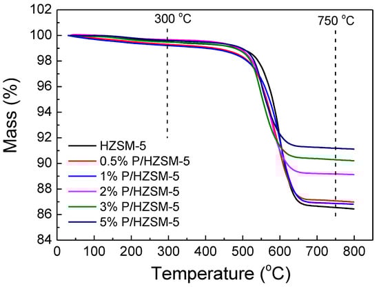 The spent catalysts were studied using thermogravimetric analysis. The weight loss of the samples on the range of 300–750 °C revealed the decomposition of coke deposition []. As shown in Figure 8, the amounts of coke deposition in the used P/HZSM-5 catalysts decreased to a certain extent. Especially, increasing P content to more than 1% resulted in an obvious decrease in coke amounts. As can be seen from the catalytic performance (Figure 7 and Table 3), when P content was above 1%, the catalyst stability and methanol conversion both decreased evidently, whereas the selectivity of PX in X improved greatly. The phenomenon may be due to the fact that high level loadings of P blocked more pore volume and external surface area, which reduced the resistance of coke deposition of the catalyst. The narrowed pore size lead by the introduction of P limited the diffusion of products and made the micropore entrance block quickly, resulting in a fast coke deposition rate and deactivation of the catalyst.