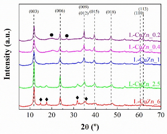 The identification of crystalline phases was carried out by powder X-ray diffraction. In all cases, the XRD patterns of LHDs synthesized (Figure 1) are similar to those reported in the literature [1,45]. The most intense peaks correspond to the typical basal (00l) planes, thereby, those located at 2θ (°) ≈ 12, 24 and 34 are attributed to the (003), (006) and (009) planes. These can be indexed in a rhombohedral symmetry, which is assigned to a (Cu,Zn)1−xAlx(OH)2 (CO3)x/2 m H2O layered double hydroxide (Powder Diffraction File: PDF: 00-37-0629). In addition, less intense peaks ascribed to non-basal planes of hydrotalcites are also observed, together with other low intense peaks, mainly in those LDHs whose Cu2+ or Zn2+ content is higher. Thus, in the case of Cu-rich LDH, diffraction peaks attributed to copper(II) hydroxide are presented, while Zn-rich LDH also exhibits broad and poorly defined diffraction peaks attributed to zinc hydroxycarbonate.