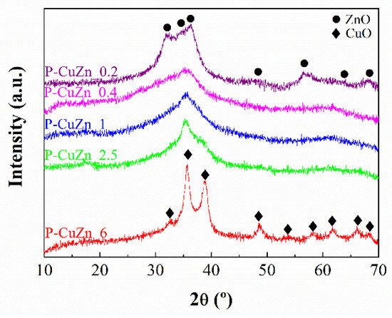 CuZnAl-based hydrotalcites have been previously studied by FTIR and Raman spectroscopies, demonstrating that the Cu/Zn molar ratio influences their microstructure. Thus, higher Cu/Zn ratios lead to more homogeneous CuZnAl hydrotalcites, while lower values give rise to less homogeneous structures due to its composition is closer to pure ZnAl and CuAl hydrotalcites [46]. This latter could provoke the asymmetric broadening of Bragg peak profiles of LDH for lower Cu/Zn molar ratio, also characteristic of the stacking disorder for Zn-rich compounds (Figure 1). Moreover, this Raman study also confirmed the presence of carbonate species, not only as counterion in the interlayer region of LDH, but also in partial segregated malachite for high Cu/Zn molar ratios, which is in agreement with XRD data [46]. Following the procedure described by Santos et al. for (Cu,Zn)1−xAlx(OH)2(CO3)x/2·mH2O LDHs [46], these layered materials were thermally treated at 300 °C for 4 h. In their XRD patterns (Figure 2), a broadening of the diffraction peak in comparison to their respective LDHs is noticeable, as a consequence of the stacking disorder of the layered structure due to decarbonation and dehydroxylation of the LDH, leading to the typical diffraction peaks of their mixed metal oxides [1]. Thus, XRD profiles reveal an evolution from the calcined Cu-rich (P-CuZn_6) to the Zn-rich (P-CuZn_0.2) sample. In this sense, the XRD pattern of calcined P-CuZn_6 displays defined bands located at 2θ (°) = 32.5, 35.5, 38.7, 48.8, 53.5, 58.3, 61.6, 66.2 and 68.1 assigned to CuO (PDF: 00-048-1548). The progressive increase in Zn content gives rise to a much more amorphous XRD pattern, being only a broad band observed at 2θ (°) ≈ 33. These data suggest that calcined P-CuZn_2.5, P-CuZn_1 and P-CuZn_0.4 display a more amorphous structure, or are formed by smaller particles than that the calcined P-CuZn_6. For the calcined LDH with the highest Zn content (P-CuZn_0.2), broad bands at 2θ (°) = 31.8, 34.4, 36.2, 48.3, 56.5, 63.1 and 68.2, start to emerge. These peaks are assigned to hexagonal ZnO (PDF: 00-36-1451). On the other hand, no diffraction peaks could be ascribed to the presence of crystalline Al species, in such a way that these species must be amorphous, or dispersed in the other phases.