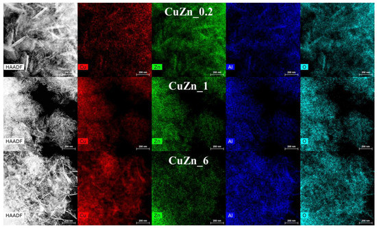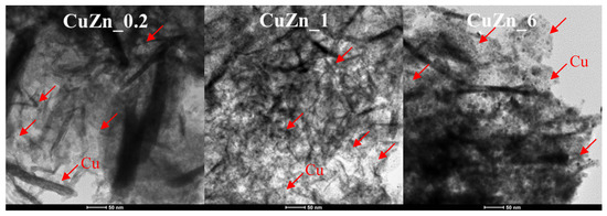 In order to elucidate the catalyst morphology, CuZn_X catalysts were analyzed by TEM (Figure 5). In all cases, the micrographs allow to distinguish different morphologies, including layered structures probably due to the hydrotalcite structure that did not fully collapse after the thermal treatment. These data are in agreement with the literature, where a proportion of the layered structure was reported to be maintained after the thermal treatment [54]. In addition, it is noticeable the presence of pseudospherical and well-dispersed nanoparticles, mainly in the samples with a higher Cu content. In both cases, these particles are very small, below 15 nm.
