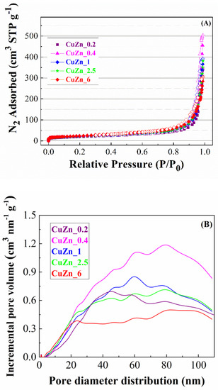 The textural properties of CuZn_X catalysts were evaluated from their N2 adsorption-desorption isotherms at −196 °C (Figure 7A). According to the International Union of Pure and Applied Chemistry (IUPAC) classification [55], these isotherms can be considered as Type II, which are typical of macroporous solids, as suggests the great growing of N2 adsorbed at high relative pressure. The shape is similar for all CuZn_X catalysts, and, consequently, the modification of the Cu/Zn molar ratio does not seem to affect the textural properties of catalysts (Table 2). Thus, SBET values hardly vary, being between 70 and 85 m2 g−1, while t-plot data indicate that the surface ascribed to the microporosity can be considered as negligible, since values are below 10 m2 g−1 in all cases. In the same way, the pore volume is very similar for all catalysts, being in the range 0.474–0.679 cm3 g−1, while the micropore volume is very low in comparison to the total volume.