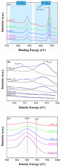 However, from this contribution, it is not possible to discern between Cu+ and Cu0 species, so the Auger CuLMM signal is used to identify these oxidation states [30,32]. The broad Auger CuLMM band (Figure 8B) can be deconvoluted in two main contributions: 918.5 eV, which is ascribed to Cu0, and 917.0 eV due to Cu+ [30]. The proportion of Cu0 increases directly with the Cu content, being about 65–70% of the total reduced Cu species. The analysis of the Zn 2p region (Table 4) evidences a single band between 1021.6–1022.1 eV, which is assigned to ZnO. Some studies of Cu/ZnO catalysts have demonstrated that ZnO can be partially reduced, arising a new contribution located at lower binding energy. This new band is not observed in the Zn 2p core level spectra; however, the Auger ZnLMM line (Figure 8C) shows an asymmetric band that would confirm the existence of a small proportion of Zn partially reduced (Znδ+), or even a synergistic effect between Cu0 and ZnO [59,60]. With regard to the Al 2p core level spectra, all CuZn_X catalysts display a contribution about 74.3 eV, which can be attributed to Al2O3 [61]. In the case of O 1s, all catalysts display a main contribution located about 531.0 eV, assigned to oxide species, and another less intense at 532.6 eV, that is assigned to hydroxyl and/or carbonate [61]. The existence of carbonates could be confirmed by the signal at a binding energy of 288–289 eV in the C 1s core level spectra [61], which could result from a low proportion of LDH, or a possible carbonation of the catalyst surface.