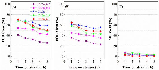 Thereafter, CuZn_X catalysts were studied in the FUR hydrogenation at 190 °C (Figure 9). All the catalysts are prone to suffer a progressive deactivation, which could be a consequence of the strong interaction of FUR, or FOL molecules, with Cu active sites [68]. The catalyst with the lowest Cu content (CuZn_0.2) is also the least active catalyst, reaching a FUR conversion of 40% after 1 h of time-on-stream (TOS), which decreases until 26% after 5 h. By increasing the Cu content, the catalytic performance is clearly improved, since CuZn_0.4 attains a FUR conversion of 43% after 5 h of TOS, while CuZn_1 seems to be the most stable catalyst with a FUR conversion of 59%. However, this trend is not followed when the Cu content raises further, since both CuZn_2.5 and CuZn_6 catalysts exhibit a similar pattern, reaching a FUR conversion close to 50% after 5 h of TOS.