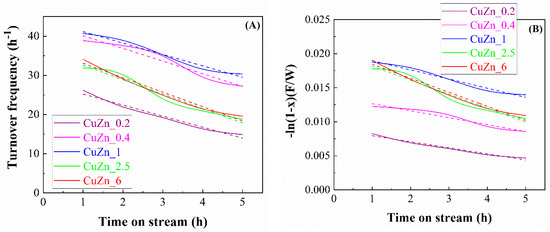 Linearization of TOF values (A) and FUR consumption rate (B) with time-on-stream for CuZn_X catalysts.