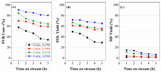 Considering that CuZn_1 showed the longest lifetime, as well as the most efficient Cu active sites (Table 5), this catalyst was selected to evaluate the influence of the reaction temperature on the catalytic performance (Figure 11). FUR conversion clearly increases with the reaction temperature (Figure 11A), from 34% to 79% after raising the temperature from 170 to 230 °C, after 5 h of TOS. Several authors have reported that FUR hydrogenation is thermodynamically favored; however, the FUR conversion often displays a volcano shape with the reaction temperature, reaching a maximum conversion at 190–210 °C [27,62]. The worsening of the conversion at higher reaction temperature was attributed to FUR polymerization, due to its strong adsorption on the active sites involved in the hydrogenation process. This trend was not observed in the present work, which could be explained by the meso- and macroporosity of catalysts and the relatively low concentration of acid sites, in such a way that the FUR-active site interaction is weaker, so the desorption of FUR and reaction products should be easier [29,37,70]. With regard to the hydrogenation products (Figure 11B,C), in all cases, the main product was FOL, reaching a maximum yield of 65% after 5 h of TOS at 210 °C. MF yield values always were very low, although they increase slightly with the reaction temperature, attaining a maximum MF yield of 7% after 5 h of TOS at 230 °C [62]. Several authors have pointed out that the formation of MF is favored at higher reaction temperature (T > 190 °C) [25,30,62]. However, CuZn_1 hardly modifies its selectivity pattern when the reaction temperature increases, probably due to the weaker interaction between the active sites and FUR molecules. Thus, this catalyst seems to be highly stable and selective toward FOL, along the TOS, in a wide range of reaction temperatures [15].
