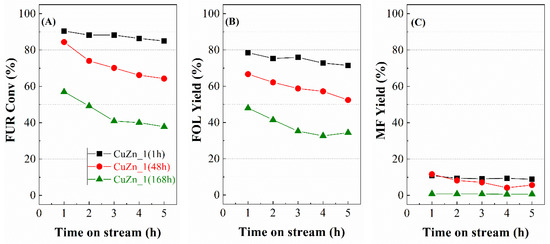In the next study, the aging time of the LDHs was modified to evaluate its influence on the catalytic behavior. Thus, three CuZn_1 catalysts with different aging time (1, 48 and 168 h) were compared. The catalytic data show that longer aging time in the synthesis of LDHs has an adverse effect on the catalytic activity (Figure 12A). Thus, that LDH whose aging time was only 1 h gave rise to a catalyst that hardly undergoes deactivation, since it maintains a FUR conversion of 84% after 5 h of TOS at 210 °C. However, a more prolonged aging treatment (168 h) worsens the catalytic activity, achieving a FUR conversion of only 37%, under similar experimental conditions. The selectivity (Figure 12B,C) follows the same trend than that observed previously for CuZn_X catalysts, since FOL was the main product in all cases, attaining a maximum yield of 71%, after 5 h of TOS at 210 °C, with CuZn_1 aged for 1 h. The amount of MF was very low in all cases, although a decrease in MF yield took place as aging time was increased.