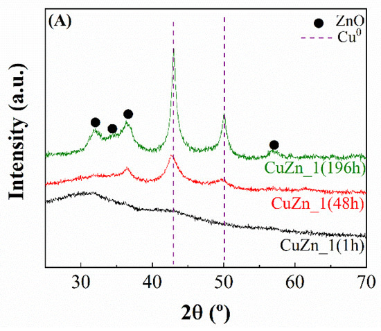 In order to understand the changes of the catalytic behavior for the CuZn_1 catalysts synthesized with different aging times, these catalysts were characterized. Their XRD patterns show clear differences in crystallinity (Figure 13A). Thus, the diffractogram of sample prepared with the shortest aging time (CuZn_1(1h)) does not display any diffraction peak, which are clearly visible for catalysts obtained by increasing the aging time. Thus, CuZn_1(168h) catalyst shows Cu crystallites of 33 nm. These data are in agreement with the literature, since the use of higher temperature and longer aging time favor the growing and better crystallization of layered double hydroxides [3,71]. This fact implies the formation of catalysts where nanoparticles of support and active phase are larger.
