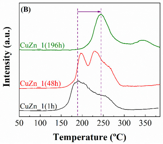 The analysis of the H2-TPR profiles also reveals clear modifications depending on the aging time (Figure 13B). Considering that the three catalysts display the same chemical composition, it is expected that the profile differences should be attributable to differences in the size of their Cu nanoparticles. In this sense, a catalyst whose Cu crystallite sizes are smaller (CuZn_1(1h)) is more easily reducible than those catalysts with bigger sizes, as a consequence of the weaker interaction between small CuO nanoparticles and the ZnO/Al2O3 support.