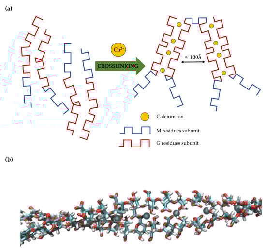 (a) Schematic representation of calcium ion mediated cross-linking mechanism of alginate strands. The calcium ions form a coordinative bond between G residues forming large pores (approximately 100 Å according to [54]) between cross-linked strands; (b) molecular model of alginate-Ca2+ hydrogel. Green indicates carbon atoms; red, oxygen; white, hydrogen; grey balls between alginate strands, calcium ions.