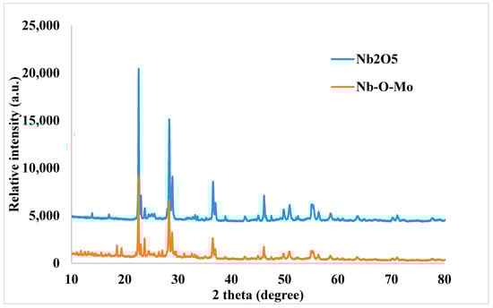 There are several methods for the synthesis of catalysts such as precipitation, incipient wet impregnation, sol-gel method, physical/direct mixing, grafting, and ion exchange [,,]. In the present study, the chemical grafting method was used for the synthesis of the Nb–O–Mo MMCT catalyst. During the synthesis, the deprotonated NbO- is formed on the surface of Nb2O5 by the basicity of TMG (1,1,3,3-tetramethylguanidine), where Mo from MoCl5 is linked to form Nb–O–Mo MMCT linkage, which helps the photocatalytic process under fluorescent light. The XRD pattern of Nb2 O5 was assigned via JCPDS PDF # 27-1003 []. The characteristic diffraction peaks of Nb2O5 at 22.5°, 28.3°, 36.5°, 46.1°, and 50.9°, (Figure 1) were identical to the orthorhombic structure of Nb2O5 reported in the literature []. New diffraction peaks appeared at 18.55 and 19.36° when Mo is anchored on Nb2O5. Moradi et al. [] found that the intensity of the Fe-doped TiO2 peaks was decreased compared to those of undoped TiO2, indicating that the addition of Fe3+ decreased the crystallinity of TiO2. In addition, doping of Mo in VO2(M) barely affected XRD patterns, while the doping of Nb in VO2(M) resulted in decreases in XRD peaks []. A similar trend was observed in the intensity of the XRD peaks for the Nb–O–Mo catalyst compared to pure Nb2O5, indicating slightly reduced crystallinity. The reduced peak intensities, with corresponding angles, are shown in Table 1.