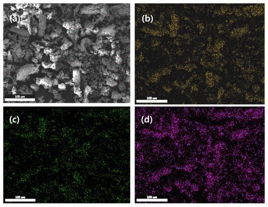 (a) SEM image of Nb–O–Mo and corresponding EDS element mapping of (b) Nb, (c) O, and (d) Mo.