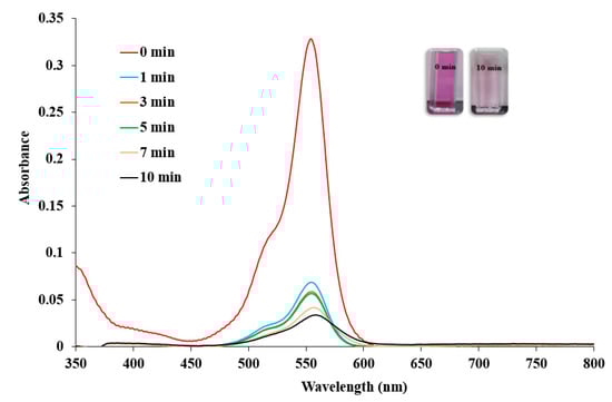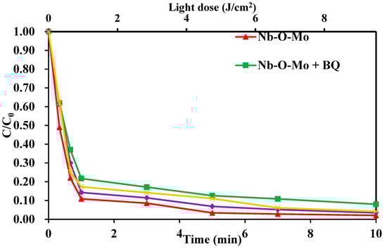 The performance of the developed Nb–O–Mo catalyst outperforms that of the reported catalytic materials. Wang et al. [] prepared homogeneously decorated Pt quantum dots on TiO2 nanotube arrays, using a modified photo irradiation-reduction method for Rh B decolorization. They found that 73.47% of the Rh B was degraded after 180 min of UV irradiation. Abdel-Messih et al. [] used TiSn10 and pure titania as catalysts, achieving approximately 92% and 72% decolorization of Rh B in 3 h under UV irradiation. Kuo et al. [] achieved photocatalytic decolorization of Rh B (~94%) in 300 min, by illuminating the surface of ZnO nanowires on silicon wafers.