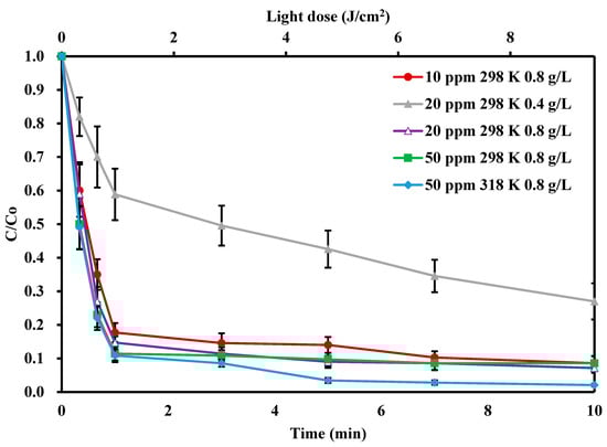 The catalytic decolorization of Rh B was examined at different concentrations of 10, 20, and 50 ppm, to understand the influence of concentration on decolorization efficiency from the graphs of C/C0 as a function of reaction time (Figure 7), where C0 is the initial concentration of Rh B and C is the concentration at a certain time. It should be noted that there is no significant decrease in decolorization performance in 10 min, even with an increase in the concentration of Rh B from 10 to 50 ppm, while decolorization performances in 1 min were increased for all concentrations. Such a significant decolorization in a short time was reported for catalysts (80%~97% decolorization in 1 min for WO3/MoCl5 [] with a rate constant of 104.4/min). When the temperature was increased in 50 ppm solution from 298 to 318 K, the performance was improved after 1 min. When the catalyst amount decreased from 0.8 and 0.4 g/L for 20 ppm Rh B solution (Figure 7), the decolorization performance was decreased by 53% for 1 min and 19% for 10 min. The control experiments without catalysts under a fluorescent light were carried out for all three dyes with 20 ppm concentration at 298 K (Figure S5 in supporting information), showing no significant decreases of dye concentration, due to the absence of catalysts.