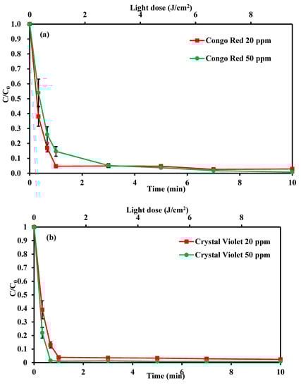 Catalytic decolorization of (a)Congo Red and (b) Crystal Violet at various dye concentrations at 298 K, with a fixed loading of Nb–O–Mo catalyst. Error bars represent standard deviations (n = 3).