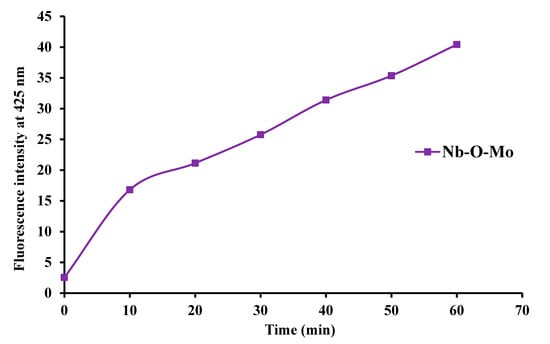 To investigate the reaction mechanism of Rh B decolorization with Nb–O–Mo, different scavengers, such as benzoquinone (BQ, O2−• scavenger) of 0.108 g [], NaHCO3 (h+ scavenger) of 0.168 g [], and isopropyl alcohol of 0.060 g (IPA, •OH scavenger) [] were separately added to reaction mixtures containing Rh B dye solution and catalyst, where the scavengers interact with reactive radicals. Superoxide anion radical (O2−•), electron-hole (h+), and •OH are the primary active radicals in decolorization processes []. Each addition of the scavengers into Rh B solution showed decreases in concentrations (Figure 9), compared to that without scavengers, indicating that O2−•, h+ and •OH participate in the decolorization process. Moreover, when BQ was added into the Rh B solution with Nb–O–Mo, the decolorization of Rh B was more depressed, revealing that O2−• is likely to be the dominant active species in the decolorization process. The anchoring of Mo5+ with Nb2O5 broadens its visible light absorption and more electron-hole pairs are formed. The formed oxo-bridged linkage between Mo and Nb2O5 can accelerate the e−/h+ separation and inhibit the recombination of the generated electron-hole pairs; as a result, more generated electrons can react with O2 to form O2−• radicals. Zhang et al. demonstrated that the photoinduced Zr(III) via the MMCT excitation of Zr(IV)–O–Ce(III) to Zr(III)–O–Ce(IV) reduced O2 to O2−•, which was liable for the oxidation of Rh B []. In addition, generated •OH radicals in the reaction were monitored based on the oxidation of terephthalic acid (TA) to hydroxyterephthalic acid (TAOH) by •OH, where TA reacts with •OH to produce a fluorescent TAOH compound. The fluorescence intensity of TAOH increased with respect to time (Figure 10), representing the presence of •OH radicals generated in the catalytic reaction with Nb–O–Mo (see Figure S6 in Supporting Information for spectra changes over time).