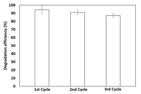 The reusability of a catalyst was examined by performing recycling experiments, because it is another important aspect as a catalyst in water treatment, due to which it can be used as an industrial catalyst and avoiding secondary pollution. After each reaction in Rh B solution, Nb–O–Mo was collected from the solution by a centrifuge and washed with deionized water, dried and reused for the next experiment. The decolorization activities of Nb–O–Mo (Figure 12) were effectively maintained during three cycles, with a 7% decrease in efficiency, which is similar to the reported catalysts, including CoxFe3−xO4 nanocatalyst [], Ag-Fe3O4 composite [], and Ag2CO3 catalyst [].
