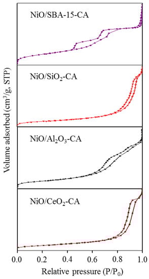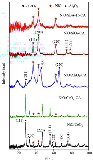 X-ray diffraction was used to determine the crystalline structure of the developed catalysts and the results are shown in Figure 1. All the calcined samples exhibited the diffraction peaks at 2θ ≈ 37.2°, 43.1°, 62.8°, 75.3° and 79.4°, which are attributed to (111), (200), (220), (311) and (222) facets of cubic crystalline structure of NiO, respectively [1,56]. However, the intensity of NiO peaks was too weak for the Ni/CeO2-CA sample, while that can be highly visible in the other samples, indicating a high degree of metal dispersion over the support surface. The difference of the peak intensity can be attributed to the different size and morphology of NiO present on the different supports. It is reported that the relatively small particle size of highly dispersed NiO on the support may also lead to the weak intensity of diffraction peaks [57]. The average crystallite sizes of the NiO were estimated from the main peak of (200) plane using the Scherrer equation. The average crystallite sizes of NiO were determined for Ni/CeO2, Ni/CeO2-CA, Ni/Al2O3-CA, Ni/SiO2-CA and Ni/SBA-15-CA and their results presented in Table 1. Strong diffraction peaks appeared in the Ni/CeO2 and Ni/CeO2-CA samples at 2θ ≈ 28.3°, 33.1°, 47.2°, 56.2° and 79.0° corresponding to (111), (200), (220), (311) and (222), which are characteristic of the cubic fluorite structure of CeO2 [58]. Additional peaks appeared in Ni/Al2O3-CA samples at 2θ ≈ 29.2°, 45.8° and 68.8° corresponding to (220), (400) and (440) diffractions of crystalline alumina [40]. Ni/SiO2-CA and Ni/SBA-15-CA samples show no peaks corresponding to silica support due to amorphous nature of silica.